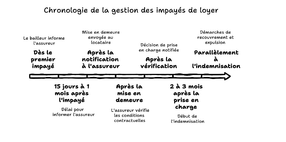 L'assureur vérifie les conditions de garantie puis vous indemnise après une franchise de deux à trois mois. Il prend ensuite en charge les loyers impayés, les frais de procédure et les éventuelles dégradations dans les limites contractuelles.
